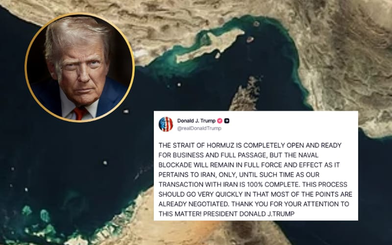 ðšThe US Naval blockade of Iranian ports stays put. Trump posted on Truth Social that the strait is "COMPLETELY OPEN AND READY FOR BUSINESS" â then immediately clarified the blockade on Iran alone, stays until a full peace deal is signed.