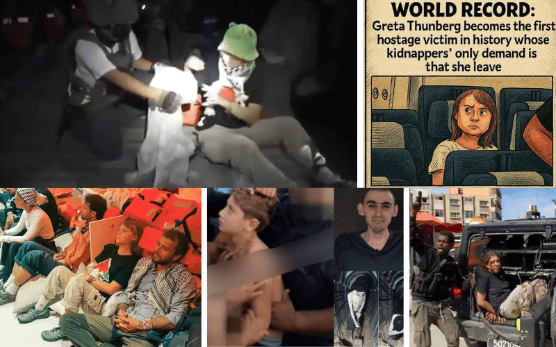 Clockwise from top-left: Greta getting a sweater handed to her by the Israelis, One of many posts on social media mocking Thunberg, Bbottom-right and centre: Israelis actually taken hostage by Hamas, Bottom-left: Photo released by Israel of Greta and her fellow activists safe and warm as they claim being “kidnapped” and taken “hostage”.