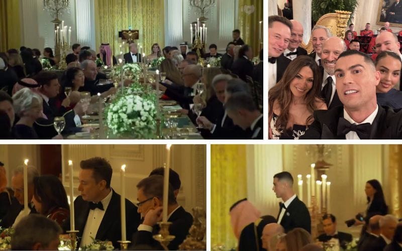 Clockwise from top-left: The President with the Crown Prince to his right and the First Lady to his left; Selfie posted by David Sacks which includes Robaldo, Elon and Howard Lutnick; Cristiano Ronaldo walking to his seat; Elon Musk at the dinner table.