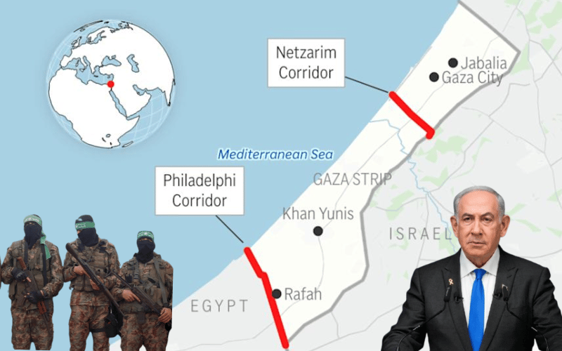 Main: Map of Gaza showing the two critical corridors; Foreground: (left) Hamas terrorists, (right) PM Bibi Netanyahu
